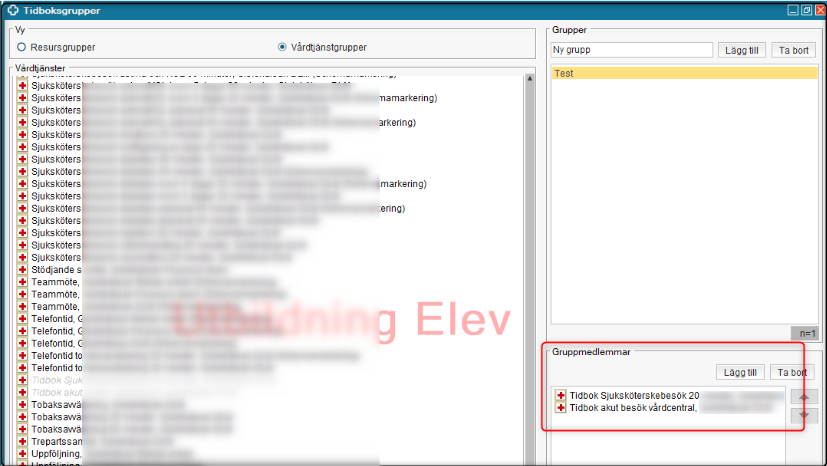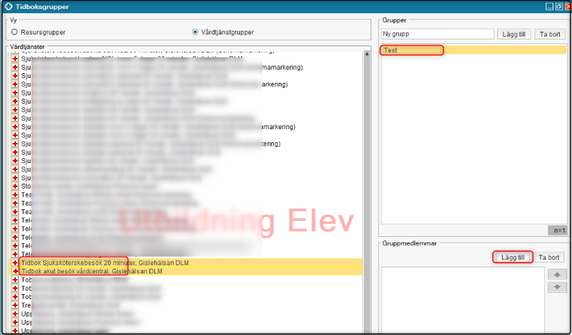 Markera aktuell vårdtjänsttidboksgrupp, markera aktuella vårdtjänster och klicka på Lägg till
