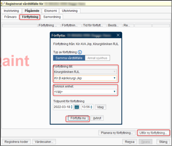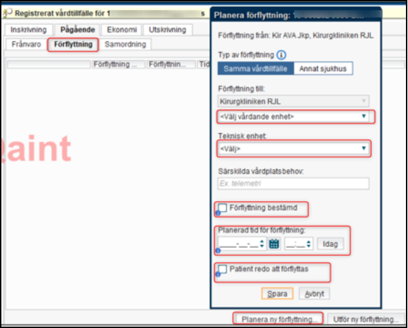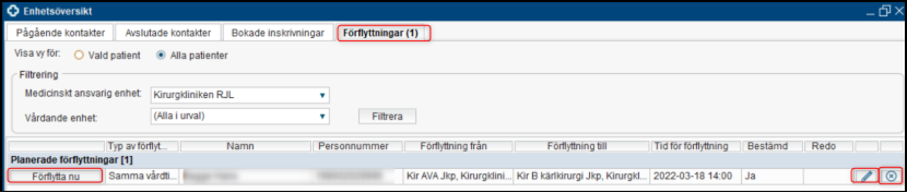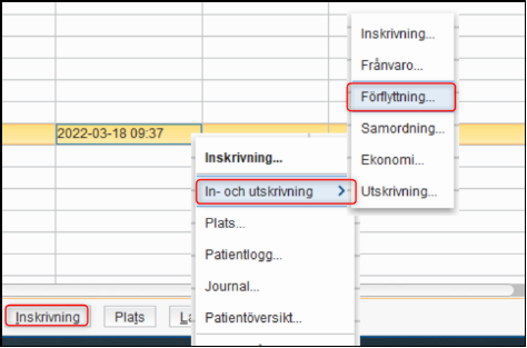 Det finns möjlighet att planera en förflyttning av patienter som behöver förflyttas till annan enhet, men behåller samma medicinska ansvar. Detta görs från fliken pågående kontakter, genom knappen inskrivning eller genom högerklick i valfri kolumn och sedan in-och utskrivning och förflyttning.