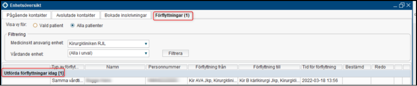 När förflyttningen genomförts släpps patientens plats på avdelningen. Förflyttningen återfinns under fliken Förflyttningar i Enhetsöversikten.