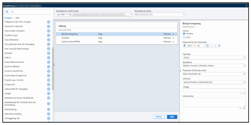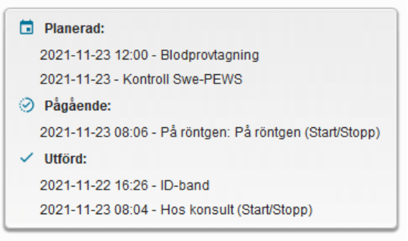Fönstret används för att hantera patientaktiviteter på en enhet där aktiviteter kan planeras, startas, bockas av, kommenteras och makuleras.