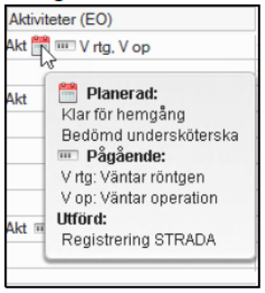 Om användaren placerar musen på aktuell ikon i kolumnen Aktiviteter i fönstret Enhetsöversikten visas en Tooltip med information om missade, planerade, pågående och utförda aktiviteter.