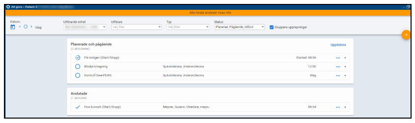 I detta fönster kan du starta och utföra planerade aktiviteter samt utföra pågående aktiviteter. Fönstret kan öppnas från fönstret Enhetsöversikt för vald kontakt genom att dubbelklicka på kolumnen Aktiviteter, välja högerklicksalternativet Aktiviteter, klicka på knappen Aktiviteter eller använda kortkommando Alt + A. Fönstret visar alla planerade, pågående och utförda aktiviteter för en vald patient och dag.