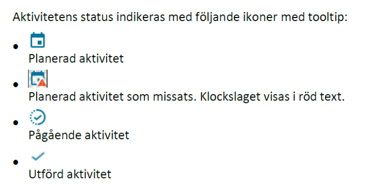 - Aktiviteter av typen ”Checklista” ändras direkt från status 'Planerad' till 'Utförd' när de valts.