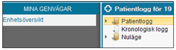 Loggen kan vara till hjälp t.ex. när du går på ditt pass och vill ha en snabb överblick över vad som hänt hittills som registrerats i Enhetsöversikten, eller när du vill se detaljer kring en inskrivning. Patientloggen är en läsvy som presenterar registrerad information från Enhetsöversikten.