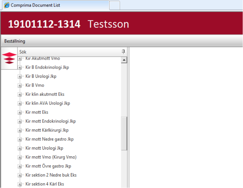 För att beställa en journal från arkivet ska du skriva in korrekt personnummer i Cosmic. Gå till Externa applikationer och klicka på Comprima. Du kommer då automatiskt till Comprimas huvudsida. Aktiverat personnummer i Cosmic följer med. Då Comprima öppnas visar träfflistan till vänster alla de enheter där patienten har skannade dokument och/ eller om det finns en pappersjournal eller mikrofilmad journal på patienten. (Obs! namn och personnummer på bilden är fiktivt).