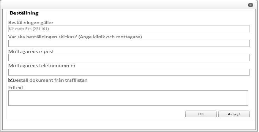 - Texten ”Beställ dokument från träfflistan” anger att beställningen kopplas till markerade dokument i träfflistan. Klicka ur bocken om önskat dokument inte kunde sökas fram men du vet att det ska finnas material att beställa på angiven klinik.