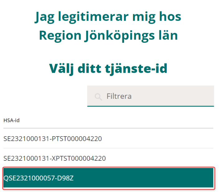 Markera aktuellt HSA-id varefter inloggning i aktuell applikation sker.