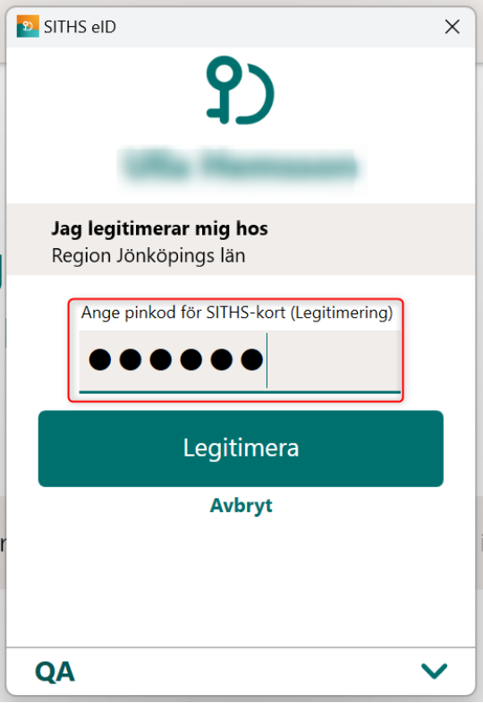 Ange legitimeringskoden för ditt SITHS-kort och tryck på Legitimera