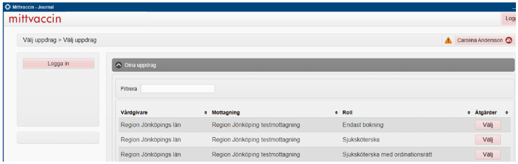 - Om du har flera uppdrag i MittVaccin måste du först välja vilket uppdrag du vill logga in med. OBS! Du får endast upp de uppdrag som motsvarar den enhet som du är inloggad på i Cosmic. Har du endast ett uppdrag kommer du direkt in i MittVaccin.