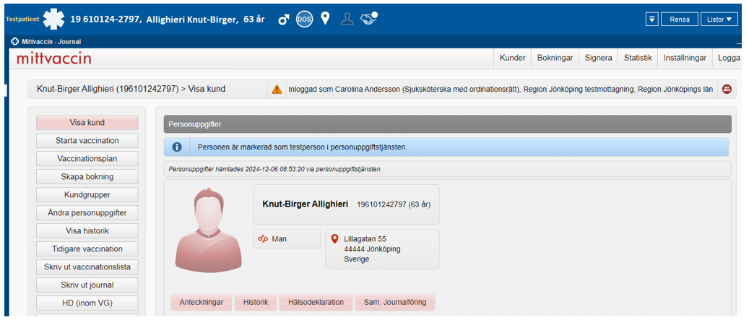 När en patient är vald i Cosmic följer patienten automatiskt med till MittVaccin.