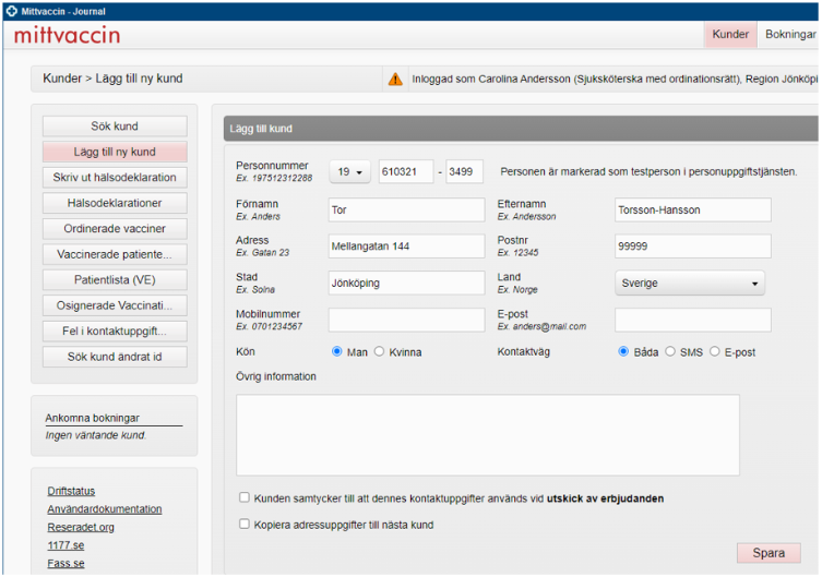 Om vald patient i Cosmic inte finns i MittVaccin kommer du direkt till vyn Lägg till kund (undantag för rollen ”Endast bokning” som kommer till tidboksadministrationen). Uppgifter hämtade från personuppgiftstjänsten (PU-tjänsten) är förifyllda. Fyll i eventuella kontaktuppgifter och klicka på Spara.