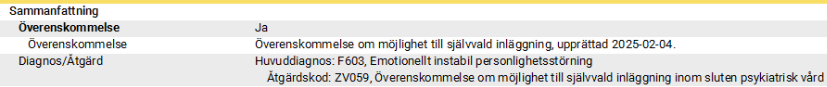 - Ange åtgärdskoden för överenskommelse om självvald inläggning vid upprättande eller revidering av överenskommelsen i öppenvård – KVÅ-kod: ZV059 Överenskommelse om möjlighet till självvald inläggning inom sluten psykiatrisk vård.