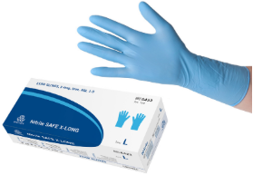 Evercare Nitrile SAFE X-long XS 15531800 S 15531801 M 15531802 L 15531803 XL 15531804 | Undersökningshandske 29 cm, texturerade fingertoppar, blå, kraftig. | Används vid undersökning och behandling i vårdmiljö där en något längre och kraftigare handske önskas exempelvis ambulanssjukvård. Kan även användas vid diskning/rengöring av instrument. | OneMed Sverige AB |