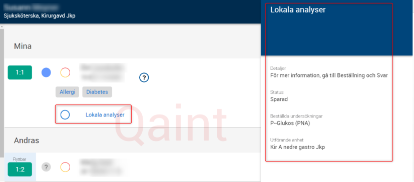 Patientaktiviteter för lokala analyser visas med statusikon ![]()