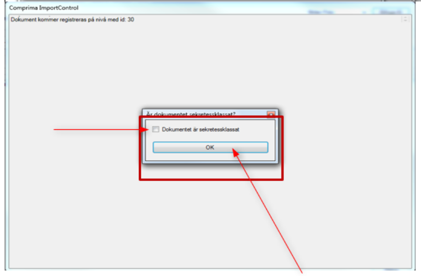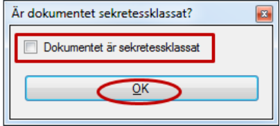 En dialogruta blir synlig med frågan: Är dokumentet sekretessklassat? Om Ja, klicka i rutan till höger om texten ”Dokumentet är sekretessklassat” och sedan OK, annars klicka direkt på OK.
