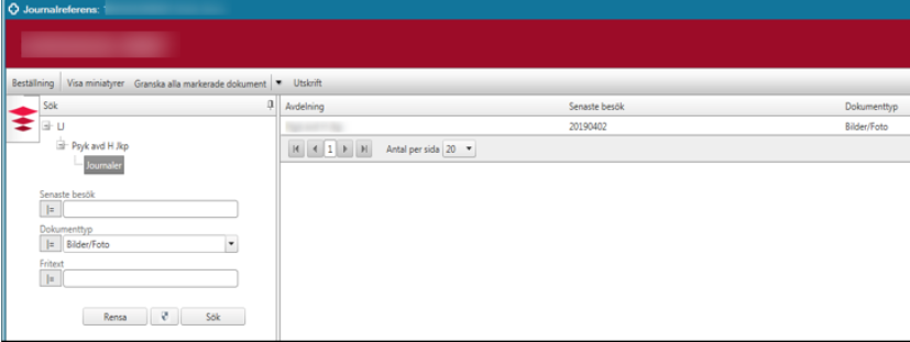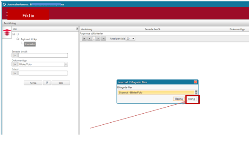 Klicka på Stäng i dialogrutan för Bifogade filer. Ange om så önskas, besöksdatum för inskannat dokument. Klicka på Skölden och därefter på Sök