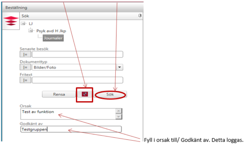Fyll därefter i Orsak och Godkänt av innan dokumenten visas. Sökningen loggas i Comprima.