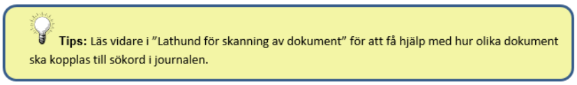 Se i övrigt Rutiner för skanning för anvisning om skanningsrutiner och Förteckning sökord/index för tydliggörande av vilket sökord som ska användas för olika dokument samt hur det ska indexeras. Du hittar detta via Manualer och rutiner/Vårddokumentation.