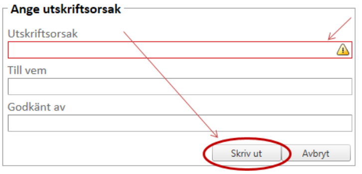 Ange utskriftsorsak, till vem kopiorna ska skickas/lämnas till och vem som godkänt utskriften. Om du inte fyller i aktuella fält visas dialogrutan med markering som i exempel ned. Klicka på Skriv ut