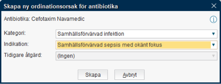 - Vid ordination av antibiotika är det obligatoriskt att fylla i uppgifter under Ordinationsorsak för antibiotika (Infektionsverktyget) som kommer upp i fältet till höger i fliken Ny…. Välj Ny ordinationsorsak om det inte finns en aktuell ordinationsorsak registrerad sedan tidigare. Fönstret Skapa ny ordinationsorsak för antibiotika öppnas. Välj Kategori (Samhällsförvärvad infektion, Vårdrelaterad infektion eller Antibiotikaprofylax) och Indikation.