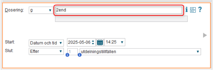 - Om det inte finns någon mall med engångsdos, markera en liknande mall. Klicka på Ordinationsdetaljer nere till höger. Ändra dos i fältet för dosering till ”Xend” (engångsdos). Istället för X anges det antal som ska ges av dosenheten. Tryck på Tab eller Enter för att verkställa doseringen. Justera vid behov klockan till den tid då dosen gavs/ska ges. Klicka på Signera eller Signera och öppna lista.