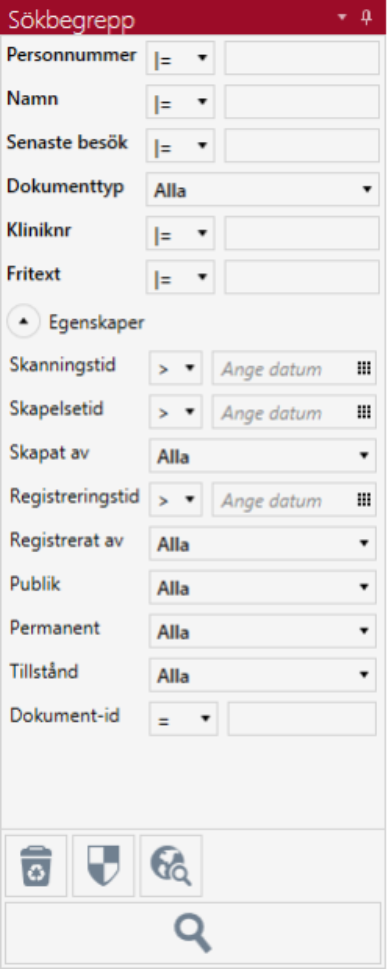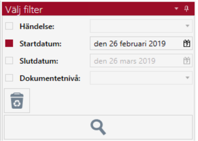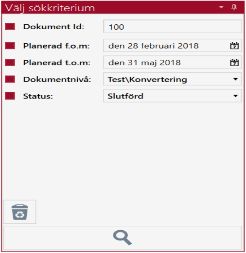 Genom att klicka på knappen med Papperskorgen, växlar man till att söka på dokument som är borttagna. Så här ser det ut när man vill söka på borttagna dokument.