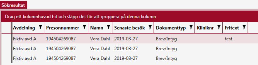Resultatet av sökningen visas i fliken Sökresultat. För Under träfflistan visas en rad knappar. (för allmän information hur man använder en träfflista, gå Träfflista) Observera att personnummer och namn på bilden är fiktiva.