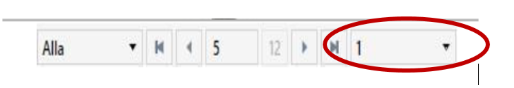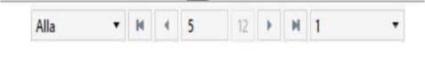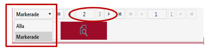 Längst till vänster finns en dropdown-lista för att navigera mellan alla dokument alternativt markerade dokument i träfflistan. Till höger om denna finns knappar för att gå till det första av dessa dokument och till föregående dokument. Nästa ruta visar vilket dokument du tittar på följt av hur många dokument som finns i träfflistan. I exemplet ovan visas dokument 5 av träfflistans 12 dokument.