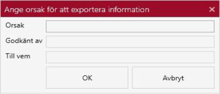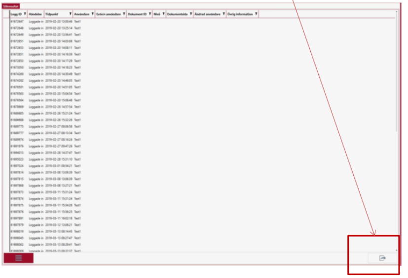 Om den är aktiverad eller inte beror på användarens behörighet. När man klickar på den får man upp en dialogruta för att spara träfflistan på något av formaten xls, CVs, html och txt om man befinner sig i träfflistan. Om man befinner sig i granskningsläge kan man få upp en dialogruta för att ange orsak för att exportera informationen varefter valda bilder sparas på disk i den katalog som användaren anger.