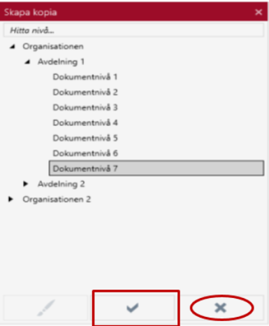 Här får man välja vilken nivå i Comprima de markerade dokumenten i träfflistan ska kopieras till. Ovanför trädkontrollen finns en textruta vid texten Hitta nivå… för att filtrera trädet (för mer information, se Filtrering av trädet). Under trädet finns en knapp för att utföra kopieringen och en knapp för att avbryta. Notera att dokumentet indexfält inte kommer att mappas om för att matcha den nya dokumentnivåns uppsatta indexfält.