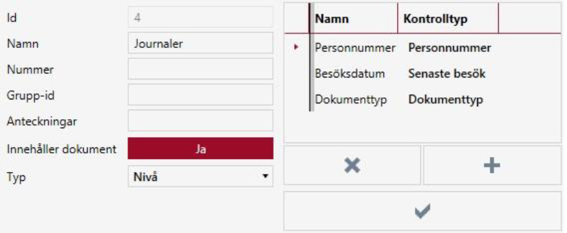 För att konfigurera en nivå för In/utcheckning gå till, Inställningar -> Nivå, och välj nivån i fråga. Lägg till två nya fält. Sätt kontrolltyperna för de nya fälten till Dokumentversion respektive Utcheckningsdatum. Spara ändringarna.