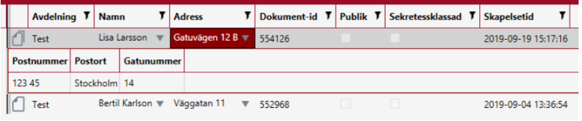 Genom att skriva in ett nytt värde i något av fälten, eller välja ett nytt värde i dropdown-listan, så uppdateras motsvarande värden för alla markerade dokument i träfflistan. De rader som har uppdaterade värden är också markerade med mörkgrå färg och vit text