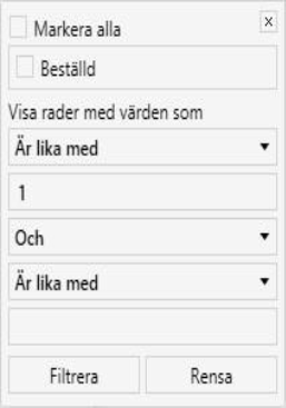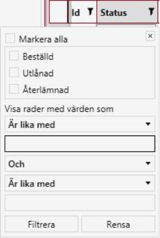Du kan, genom att använda möjligheten att filtrera, söka fram dokument med önskat status. Om du önskar se beställningar med exempelvis status Beställd och Återlämnad, klicka på kolumnen Status. Använd funktionen under Visa rader med värden som.