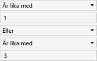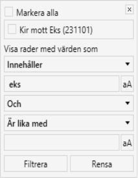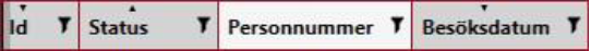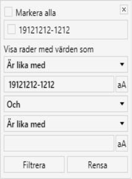 I alla andra kolumner kan man använda vanlig text för att filtrera. Du kan aktivera flera filter samtidigt för att förfina din sökning. Man kan se att ett filter är aktivt genom att filtreringsikonen är röd.