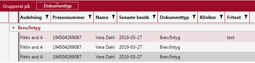 Du gruppera på en kolumn genom att dra och släppa kolumnhuvudet i det röda fältet. I nedanstående exempel har man valt två kolumner för gruppering.
