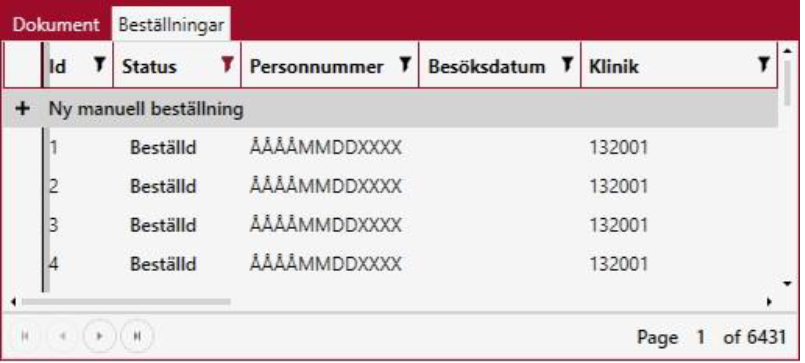 När fliken Beställningar öppnas, sker en sökning som visar de senaste skapade beställningarna överst. Träfflistan är alltså sorterad fallande på kolumnen Id.