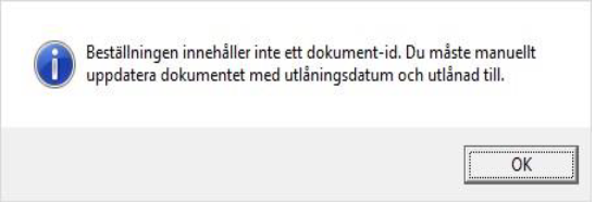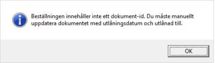 Har beställningen skapats manuellt (alltså inte via Cosmic) och saknar dokument-id så vet inte Comprima vilket dokument som ska uppdateras (utlåningsdatum och utlånad till).