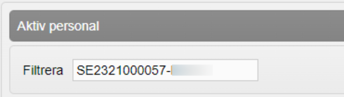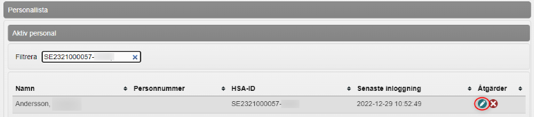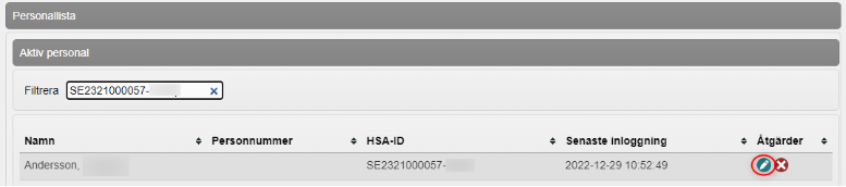 2. Under Aktiv personal visas vårdgivarens samtliga inlagda användare. Om det finns många användare kan du söka fram användaren genom att skriva eller kopiera in användarens HSA-id i fältet Filtrera. Det går även att filtrera på namn men tänk på att flera användare kan ha samma namn.
