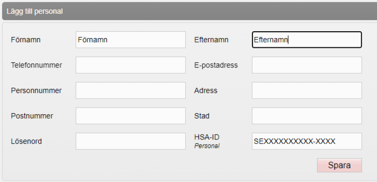4. Om användaren inte redan finns upplagd, fyll i Förnamn, Efternamn och HSA-ID och klicka på Spara. Övriga uppgifter ska inte fyllas i.