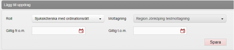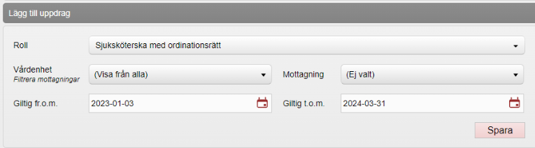 5. Under Lägg till uppdrag, välj Roll och Mottagning. Ange datum i Giltig fr.o.m. och Giltig t.o.m. om uppdraget är tidsbegränsat. Klicka på Spara.