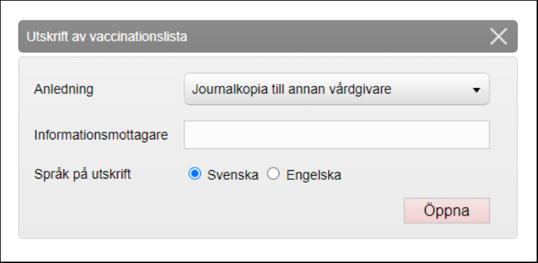 - Rutan Utskrift av vaccinationslista öppnas. Välj Anledning i rullistan och fyll eventuellt i fritextfältet Informationsmottagare (ej obligatoriskt). Ange om utskriften ska vara på Svenska eller Engelska. Klicka på Öppna.