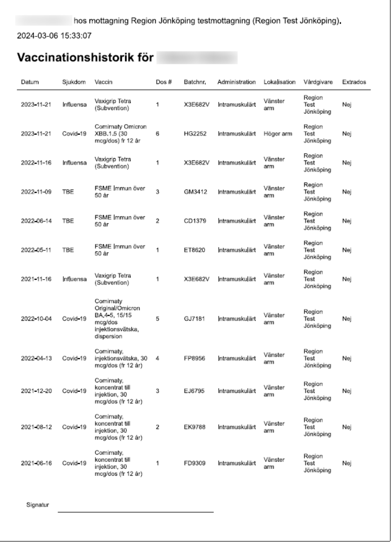 Vyn Skriv ut vaccinationslista ger en sammanfattning över givna vacciner och innehåller uppgifter om: