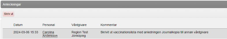 - Utförda ändringar (till exempel borttag av ordination, korrigering av registrerad vaccination, ändringar i vaccinationsplan).