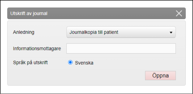 - Rutan Utskrift av journal öppnas. Välj Anledning i rullistan och fyll eventuellt i fritextfältet Informationsmottagare (ej obligatoriskt). Klicka på Öppna.