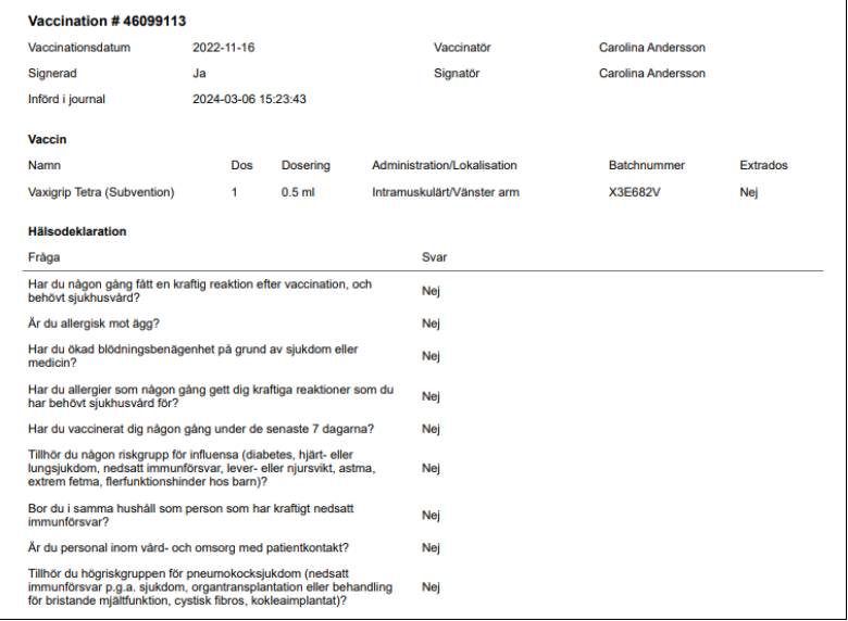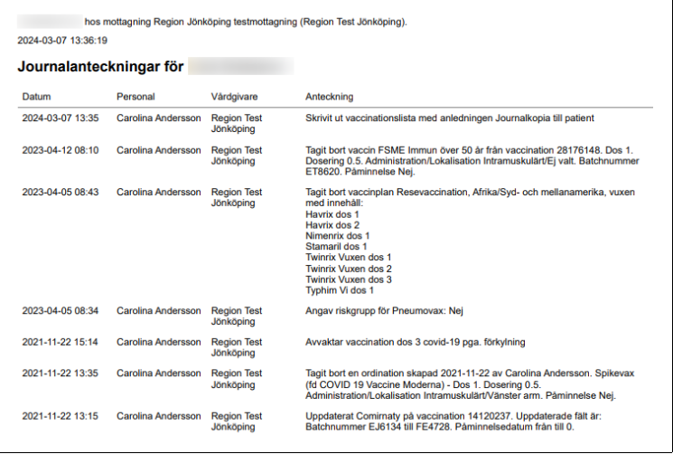 Vyn Skriv ut journal visar mer omfattande information om givna vacciner och innehåller uppgifter om: