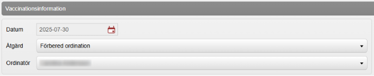 - Välj Ordinatör. OBS! Urvalet i rullisten är de användare på enheten som har behörigheten ”Läkare” eller ”Sjuksköterska med ordinationsrätt”. Listan tar inte hänsyn till om användarna är behöriga att ordinera det aktuella vaccinet eller inte. Är du inloggad som ”Sjuksköterska med ordinationsrätt” blir du automatiskt förvald. Kom ihåg att ändra till rätt ordinatör.