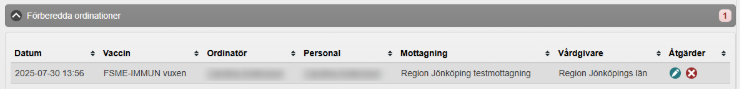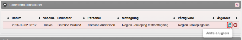 - Den förberedda ordinationen visas nu under Förberedda ordinationer i Visa kund. Den förberedda ordinationen måste nu signeras av behörig personal innan vaccinationen kan administreras.