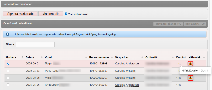 Det går att signera ordinationerna direkt från denna vy. Håll muspekaren över Vaccin för att se vilket vaccin och vilken dos som är ordinerad. En varningsikon vid Hälsodekl. innebär att det finns ett avvikande svar i hälsodeklarationen som bör kontrolleras innan ordinationen signeras (se steg 4). Klicka på Signera markerade för att signera direkt från denna vy.