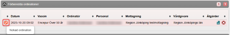 I de fall ordinatören anser det olämpligt att ordinera aktuellt vaccin finns möjligheten att välja Neka ordination. Den förberedda ordinationen ligger kvar under Förberedda ordinationer och blir markerad med en förbudsikon.