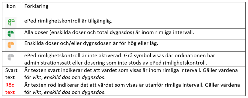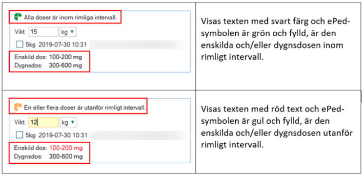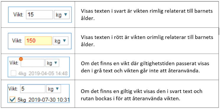 - Ange Vikt. Rimlighetskontrollen genomförs i kalkylatorn med färgindikation av ePed-ikonen och färg på texten enligt tabellen under Ikoner.